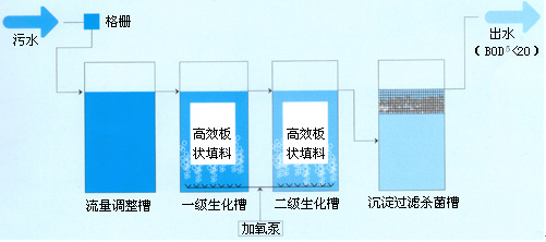 生活污水从化粪池上部进水口进入池体中一级沉淀池,比重大的部分沉入池底进行化粪处理,比重小的部分漂浮于水面上层,可从清污孔捞出,上层污水经隔舱板上安装的填料箱侧面污水通道环流进入填料箱,与其悬挂式水处理填料富集的微生物接触,使水中的有机物降解。由于改直流泛水为环流泛水化粪原理,污水在池体中增长了滞留时间,污水与填料的接触降解时间更长,有机物降解程度更高,从而使排出的污水中BOD指标大大降低。